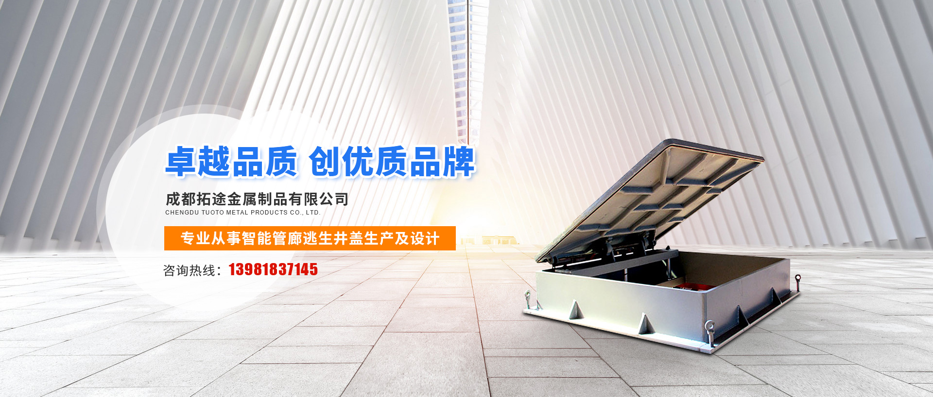成都拓途金屬制品有限公司成立于2015 年2月,座落于成都金牛高科技產(chǎn)業(yè)園興川路866號(hào),公司專業(yè)從事交通及公共管理用器材的研發(fā)、設(shè)計(jì)、生產(chǎn)。主要產(chǎn)品:管廊逃生井蓋,管廊通風(fēng)口,管廊投料口及智能交通控制系統(tǒng)。我們始終堅(jiān)持以科技求發(fā)展,質(zhì)量求生存,追求卓越,真誠(chéng)服務(wù)的企業(yè)宗旨為目標(biāo),力求給廣大新老客戶提供優(yōu)質(zhì)的產(chǎn)品及服務(wù)。 我們是一家專業(yè)從事智能管廊逃生井蓋生產(chǎn)及設(shè)計(jì)公司,我公司經(jīng)營(yíng)井蓋行業(yè)多年,專注于提供種類齊全,高質(zhì)量,長(zhǎng)壽命的智能管廊井蓋,產(chǎn)品涵蓋通...